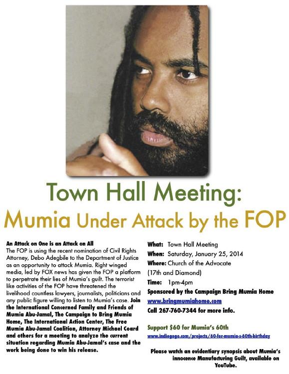 Join a Town Hall for Mumia on Saturday, January 25 from 1-4pm at the Church of the Advocate, 17th & Diamond St. in Philadelphia. Sponsored by the Campaign to Bring Mumia Home